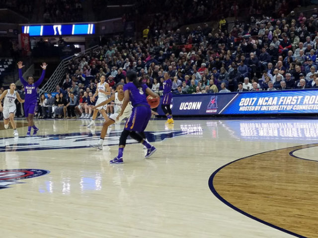 With 2:10 played the Huskies were up 9-0 and pouring it on the Great Danes. Whatever hopes Albany had of dethroning the defending National Champions UConn quickly dispel any chance of an upset. UConn came out with full court pressure for the first six minutes of the game and forced 11 turnovers in the first half. Connecticut ‘s stifling defense caused Albany to shoot a dismal 44.4 percent in the first and 35.3 percent in the second.