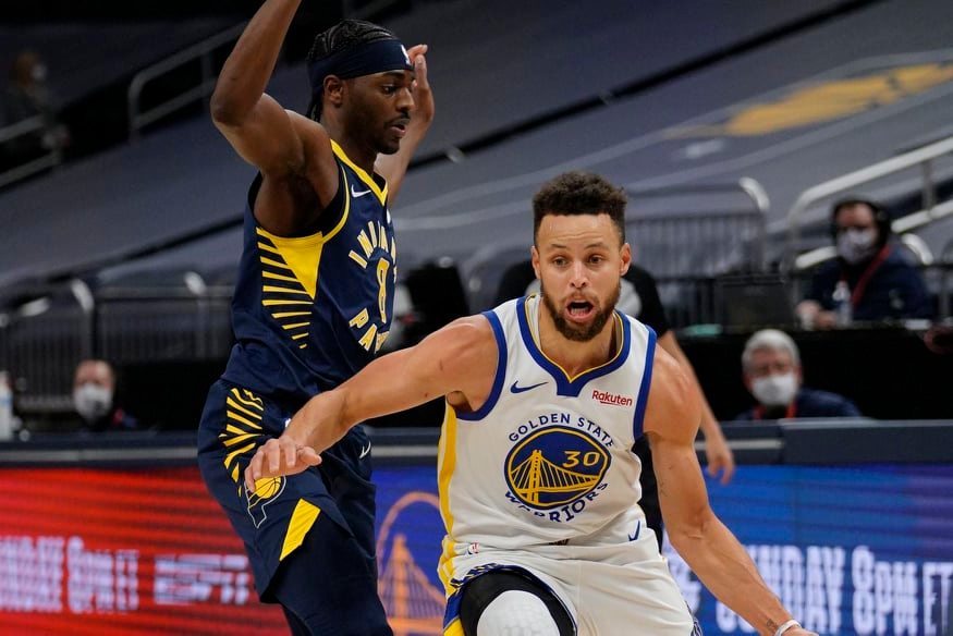 The All-Star guard made five 3s, scored 26 points and rallied the Golden State Warriors to a 102-100 victory over the Pacers in a near -sellout crowd at Gainbridge Fieldhouse.