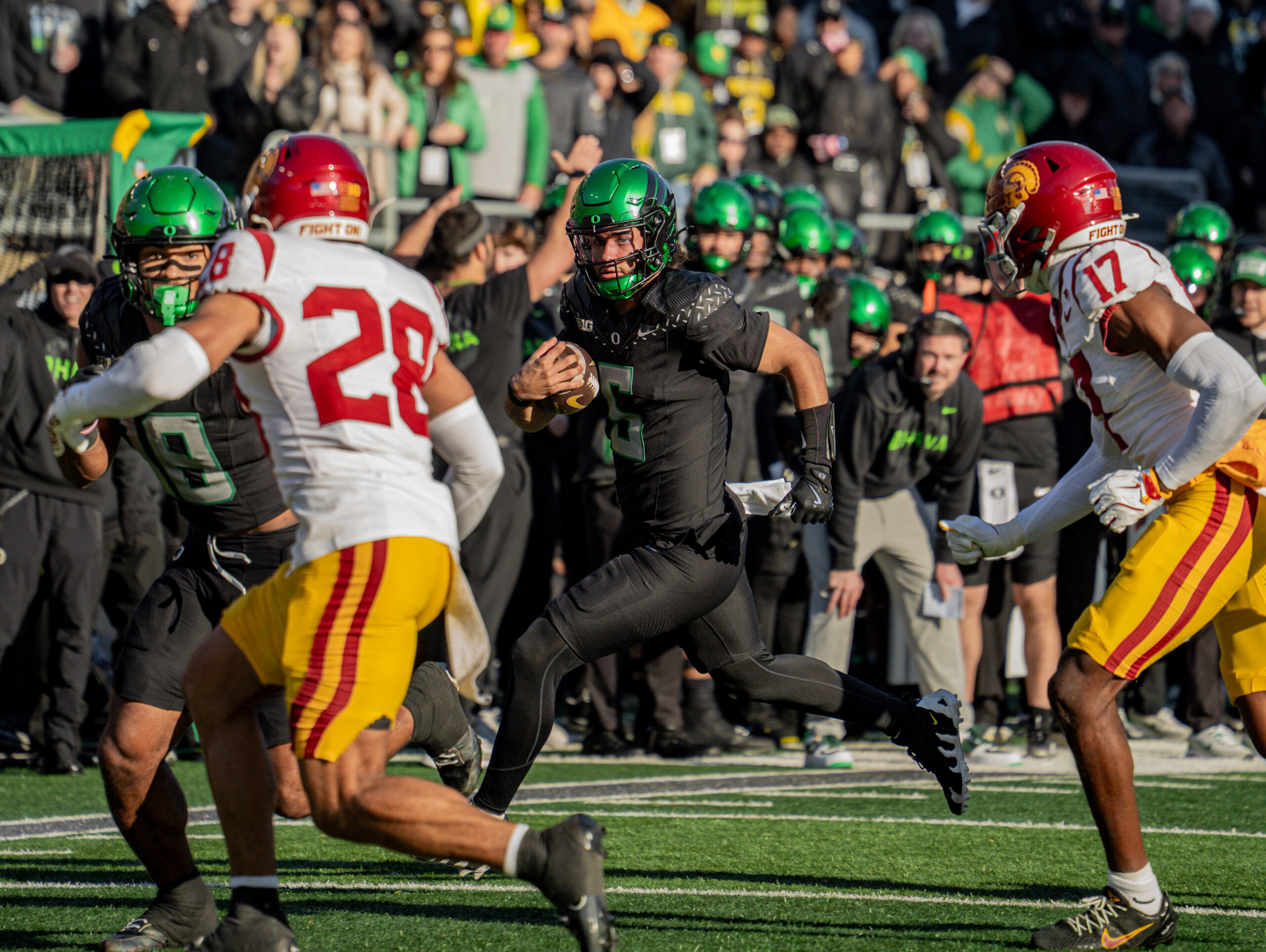 Oregon regained control on a highlight punt return as Malik Benson weaved 85 yards for a touchdown. The Ducks looked poised to settle for a long field goal later in the half, but a USC penalty on a missed 44-yard attempt extended the drive. Oregon capitalized with a 1-yard plunge from Bryce Boettcher, building a 28–14 halftime lead.