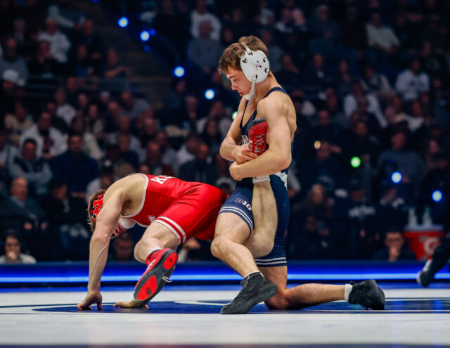 The dual took a dramatic turn at 141 pounds. Penn State’s Braeden Davis jumped out to a fast start against No. 4 Brock Hardy, leading 6-2 after one period. Hardy stormed back in the second, however, and eventually pinned Davis late in the bout. The Lions were also docked a team point following an unsportsmanlike conduct penalty, shrinking their lead to just one point after three matches.