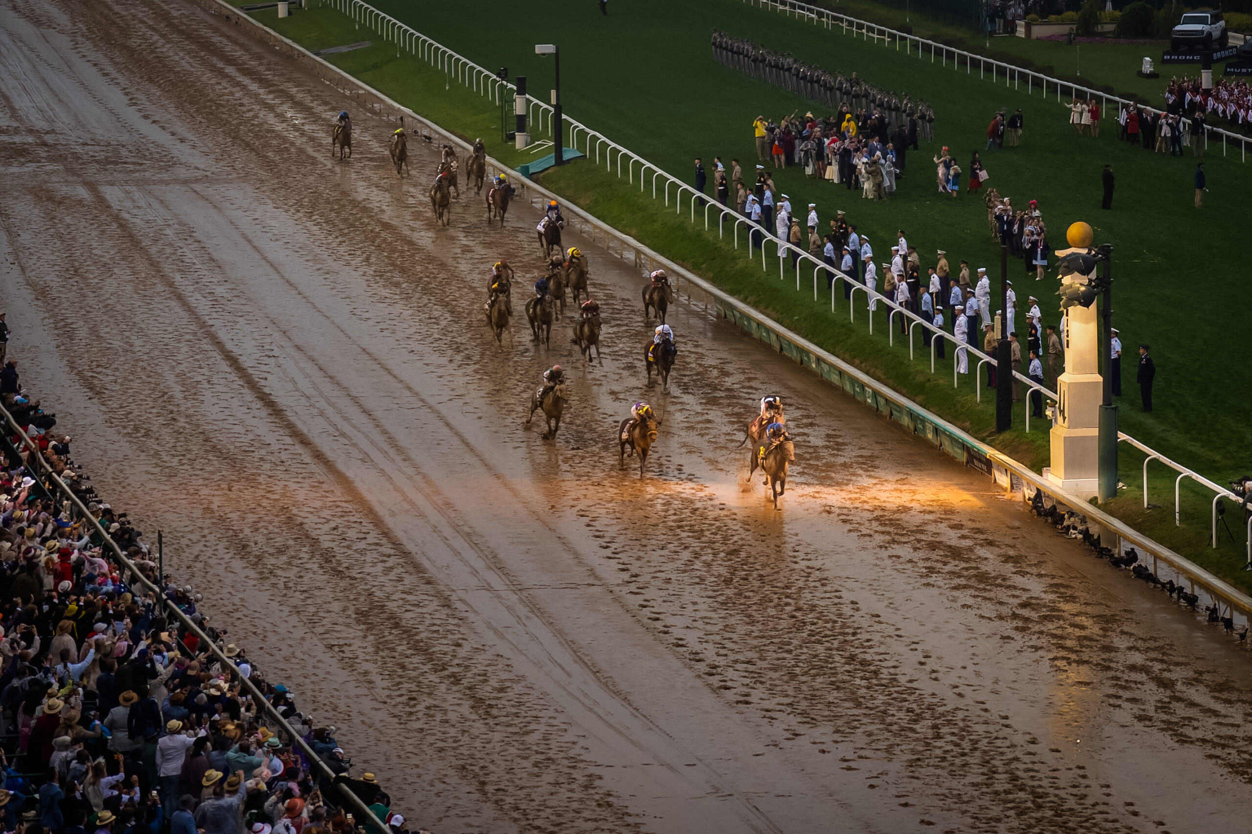 All 19 runners had to contend with tough conditions after steady rain turned the track muddy. Two horses were scratched in the lead-up to the race due to foot issues—Rodriguez, another Baffert entry, and long shot Grande. Baeza entered the field in place of Rodriguez and exceeded expectations, going off at 14-1 and finishing third.