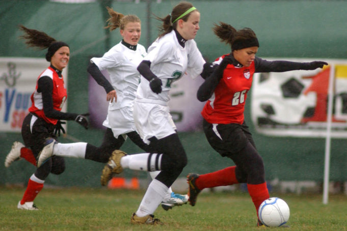 Weir's Morgan Cassels, right, moves the ball upfield during their game against Charleston Catholic in the AA-A WV girls state soccer tournament in Beckley, W.Va., on Friday, Nov. 5, 2010. AP Photo/Jon C. Hancock)