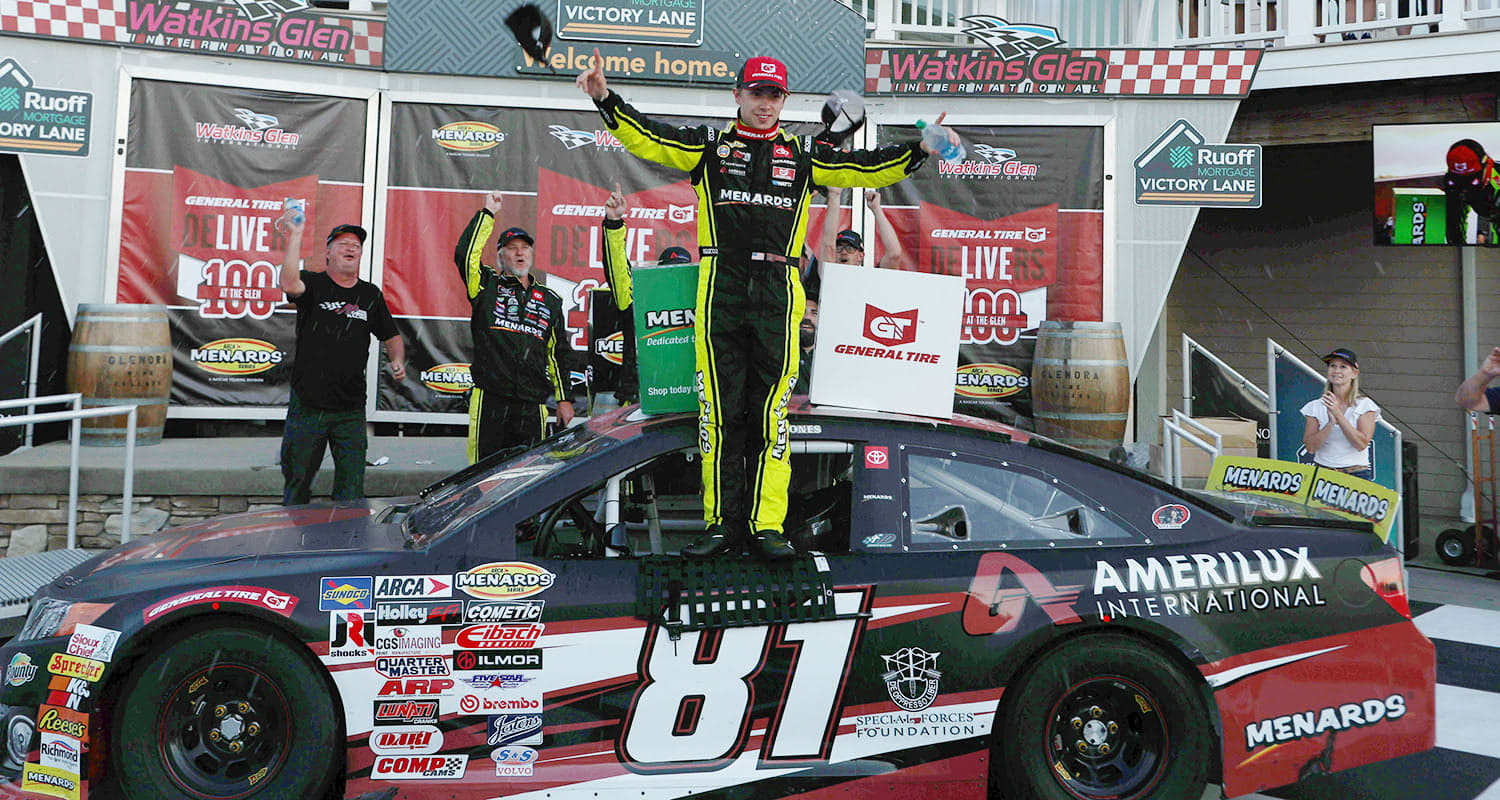 Photo Credit: Brandon Jones at the winner circle at Watkins Glen. Courtesy of Arca Menards Series